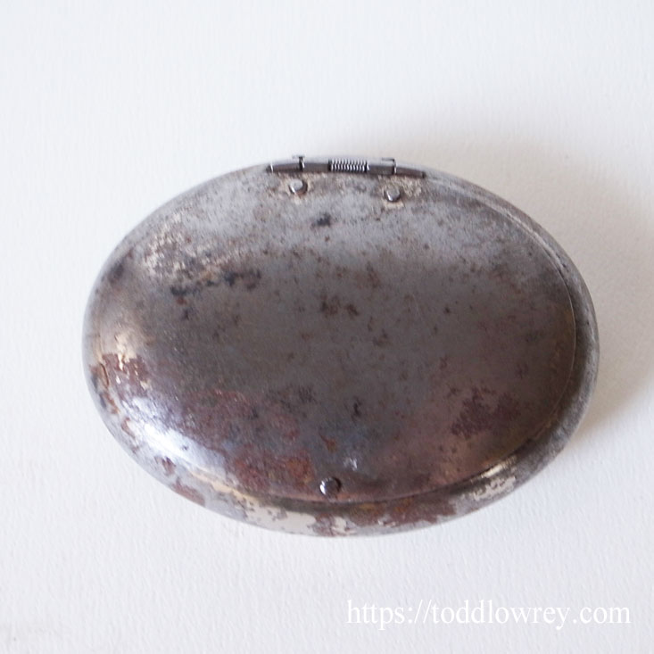 見方によってはなんだか未来的とも思えるフォルムをしており、良い具合に錆がでております。なんだろうといぶかしんでいると、店主の親爺殿が「炭鉱夫の為の噛みタバコ(Chewing Tabbaco)入れだよ。火が厳禁だったからね!」と説明してくれました。
